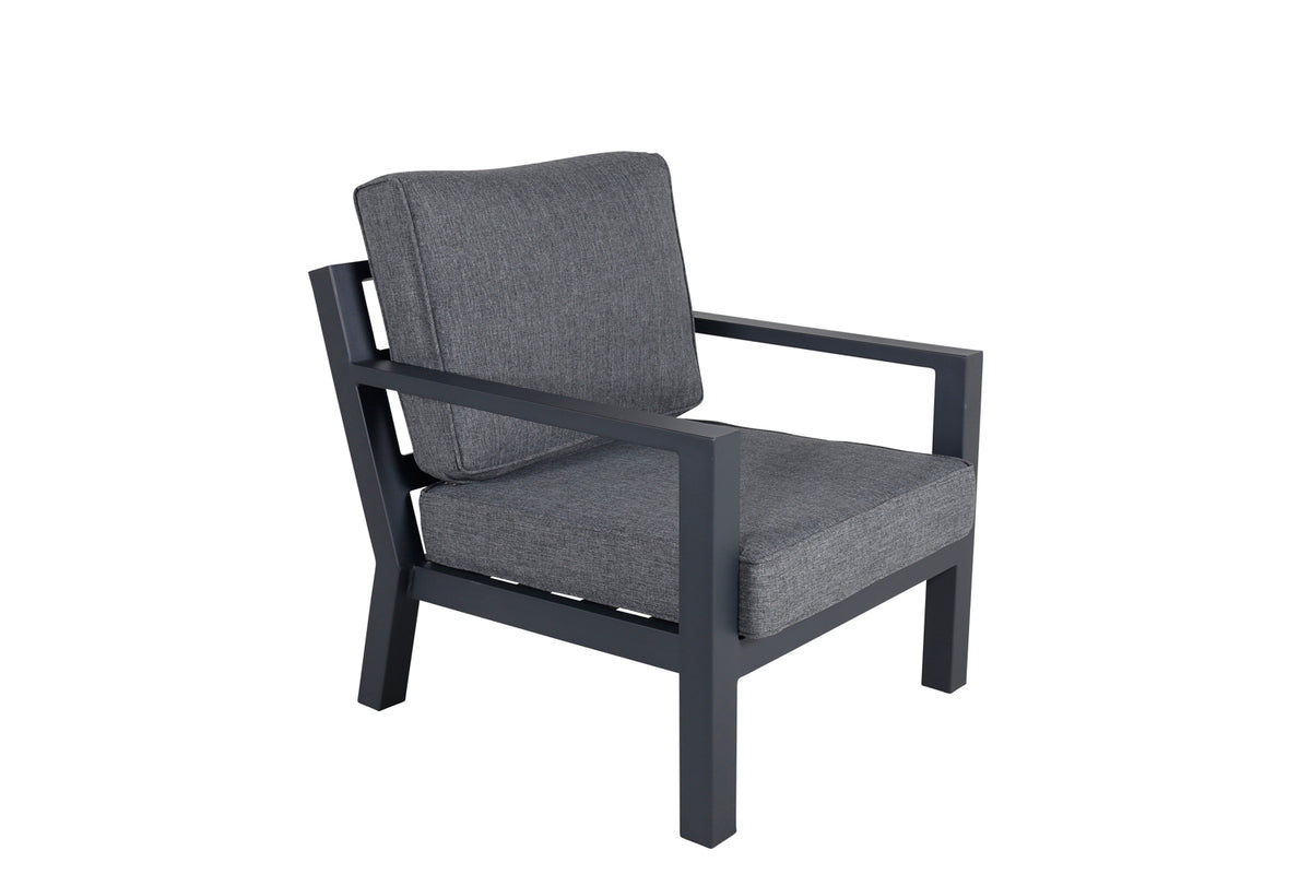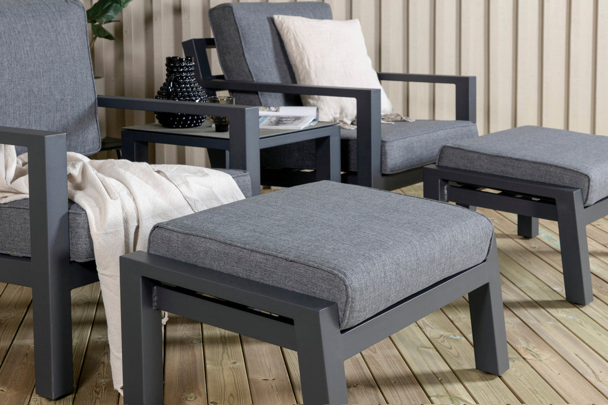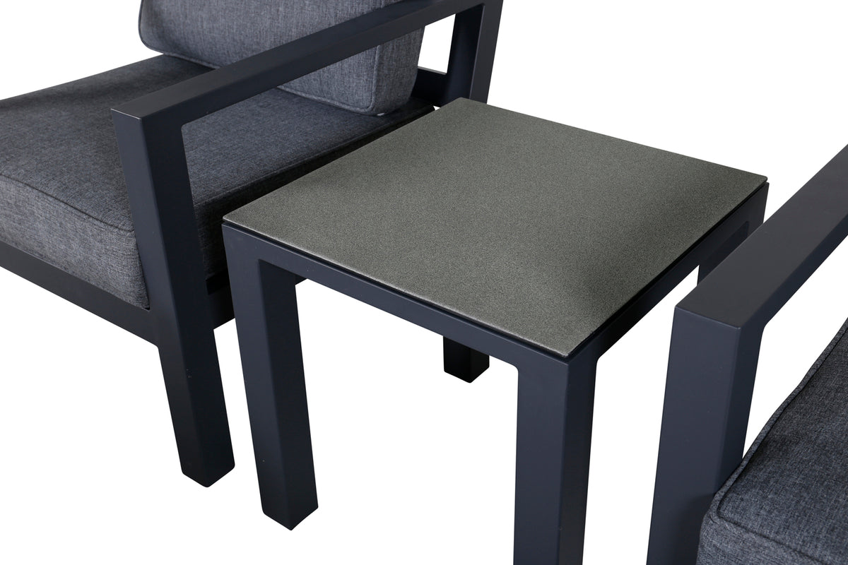 Schaffen Sie einen Hingucker, der beeindruckt – mit einem komfortablen Lounge-Set der Barcelona-Serie. Bestehend aus zwei Lounge-Sesseln in robustem Design aus schwarzem Aluminium und einem dazugehörigen Tisch mit einer Tischplatte aus stilvollem Glas. Strapazierfähige Kissen in Schwarz sind im Lieferumfang enthalten. Tischmaße: 50 x 50 x 50 cm. Stuhlmaße: 159 x 84 x 77 cm. SITZFLÄCHE: 63 x 55 x 31 cm. Keine Montage erforderlich. Hier können Sie entspannt das sommerliche Nachtleben auf dem Balkon genießen! Pflegehinweis: Gartenmöbel aus Aluminium und Edelstahl sollten regelmäßig mit Wasser und milder Seife gereinigt werden. Immer gründlich mit viel Wasser abspülen, was besonders wichtig ist, wenn die Möbel in Meeresnähe aufgestellt werden, wo Salz durch die Luft transportiert werden kann.