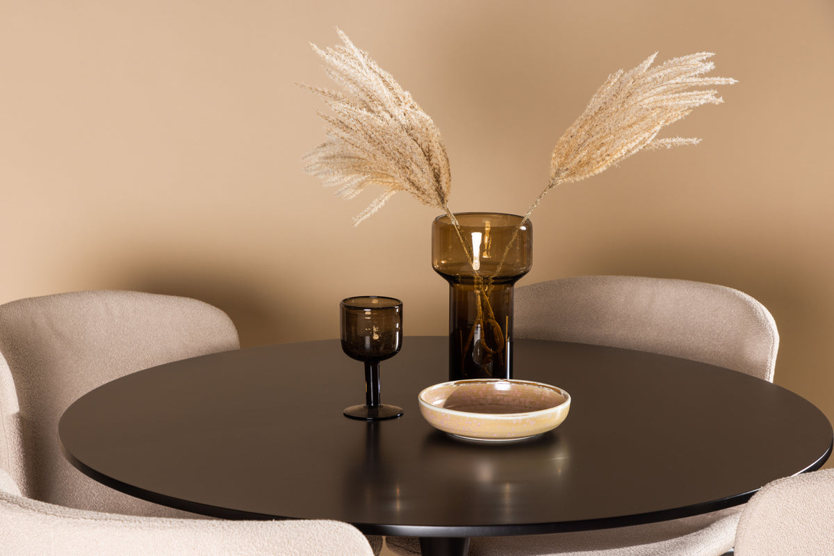 Modern und einladend! Der Esstisch Glade hat ein stilvolles skandinavisches Design mit einem schlanken Trompetenfuß aus schwarzem Stahl und einer schwarzen Tischplatte aus MDF. Hier in perfekter Kombination mit unseren grauen Esszimmerstühlen aus der Modesto-Serie. Der Stuhl ist komplett mit grauem Plüschstoff gepolstert und hat stilvolle, schmale Beine aus schwarzem Metall. Die leicht abgerundete Rückenlehne und das gepolsterte Sitzkissen bieten zusätzlichen Komfort und verlängern angenehme Mahlzeiten rund um den Esstisch. Es sollte sich gut anfühlen, sich für ein schönes Essen hinzusetzen! Tischmaße: 100 cm.