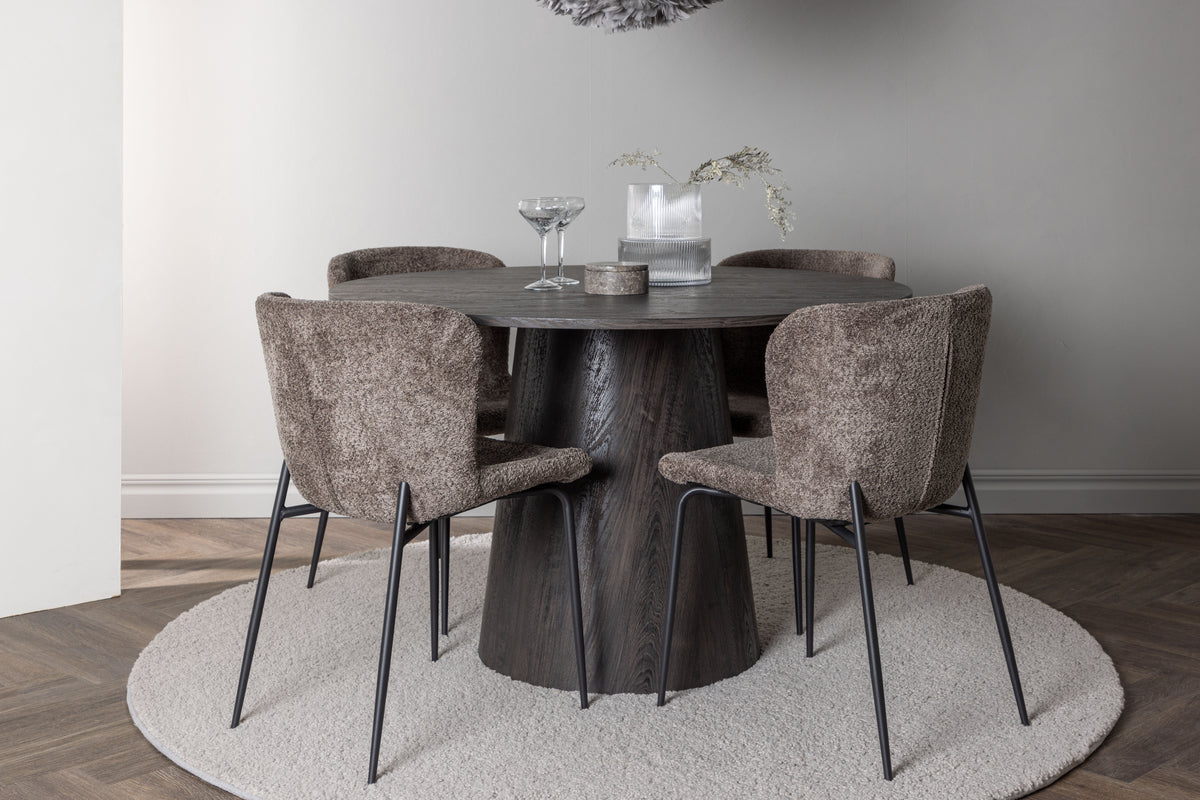 Eine gemütliche und moderne Essgruppe! Unser wunderschöner, runder Esstisch Lanzo besticht durch sein Design aus braunem MDF mit einer dünnen Tischplatte und einem gedrehten, zylindrischen Gestell, das mittig unter dem Tisch sitzt. Hier zusammen mit trendigen Esszimmerstühlen der Modesto-Serie. Der Stuhl ist komplett mit grauem Shaggy-Stoff bezogen und hat stilvolle, schmale Beine aus schwarzem Metall. Die leicht abgerundete Rückenlehne und das gepolsterte Sitzkissen sorgen für zusätzlichen Komfort und verlängern so angenehme Mahlzeiten am Esstisch. Tischdurchmesser: 120 cm.