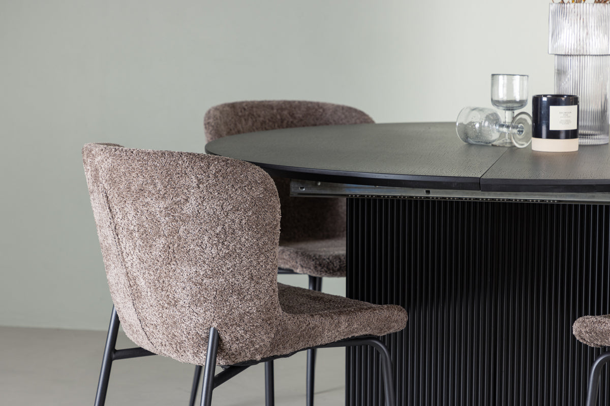 Schaffen Sie eine persönliche Atmosphäre in Ihrem Zuhause mit einem eleganten Esstisch im skandinavischen Stil, der zu vielen gemütlichen Mahlzeiten einlädt! Unser runder Esstisch Matilda ist die perfekte Lösung für Ihr Zuhause. Der Tisch verfügt über eine runde Tischplatte aus schwarzem MDF mit Furnier, die nicht nur pflegeleicht ist, sondern Ihrem Essbereich auch eine elegante Note verleiht. Die beiden blockförmigen Beine sorgen für gute Stabilität und einen modernen Stil. Tischdurchmesser: 130 cm. Das Beste an Matilda ist seine Ausziehfunktion, die die runde Tischplatte in einen ovalen Tisch verwandelt, wenn Sie mehr Gäste haben. Sorgen Sie sich nicht mehr um Gedränge. Matilda bietet Ihnen die Flexibilität, Ihren Essbereich ganz nach Ihren Bedürfnissen zu gestalten! Zusammen mit unserem ausziehbaren Esstisch Matilda bieten wir unsere eleganten Esszimmerstühle der Modesto-Serie an. Dieser skandinavisch inspirierte Esszimmerstuhl mit weichem, grauem Bouclé-Stoff und schwarzen Metallbeinen schafft eine einladende Atmosphäre im Herzen Ihres Zuhauses. Die leicht geschwungene Rückenlehne und das gepolsterte Sitzkissen bieten fantastischen Komfort, sodass Sie lange und angenehme Mahlzeiten mit Freunden und Familie genießen können! Was will man mehr? Hier erhalten Sie ein schickes Esszimmerset, das sich Ihren Bedürfnissen und Vorlieben anpasst!